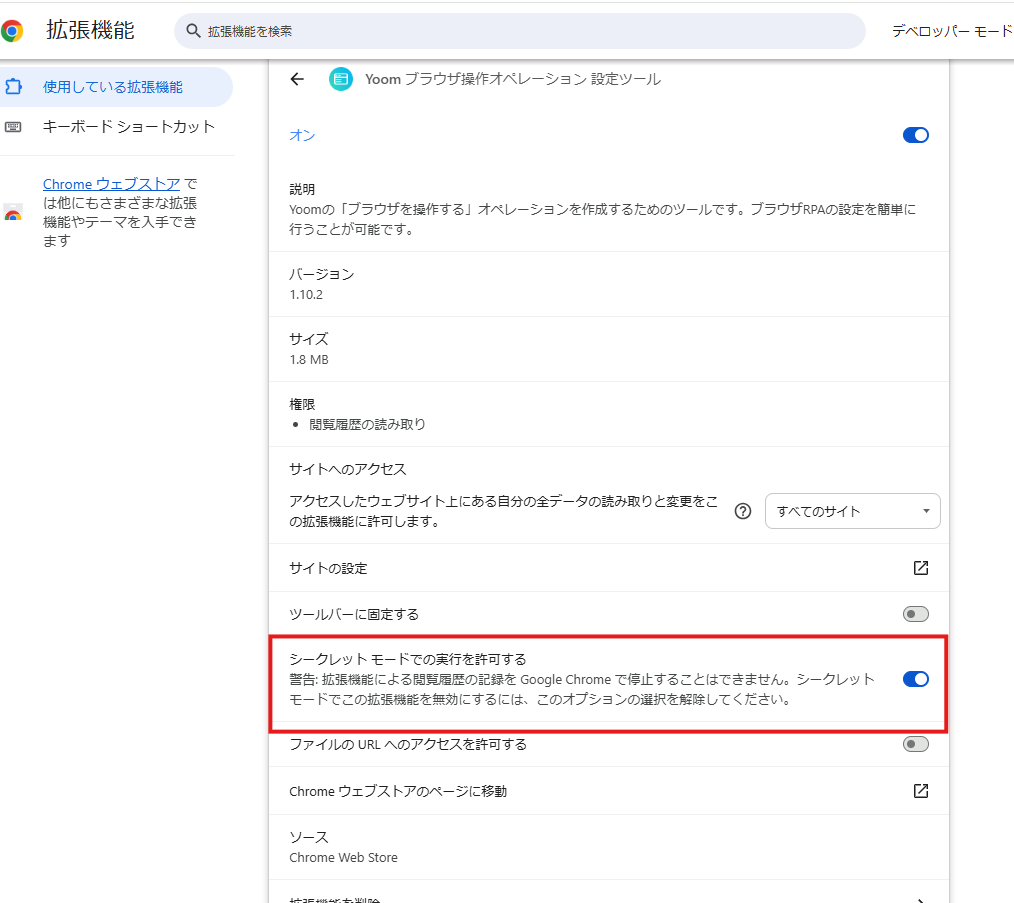下記赤枠の、「シークレットモードでの実行を許可する」をオンにしてください。