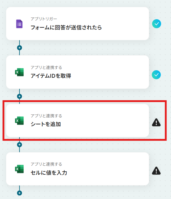 このワークフローは、Googleフォームに新しい回答が送信されると、自動でMicrosoft Excelに新しいシートを作成し、回答内容を転記します。
