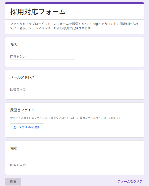 今回は以下のGoogleフォームを例として使用します。
