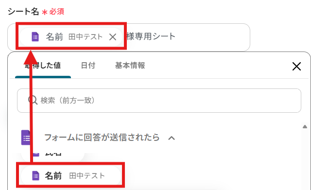今回は固定のテキストと「取得した値」を用いて以下のように設定しました!