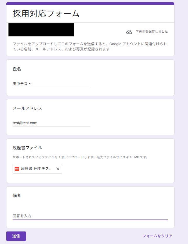 Googleフォームにテスト用の回答を送信しましょう。