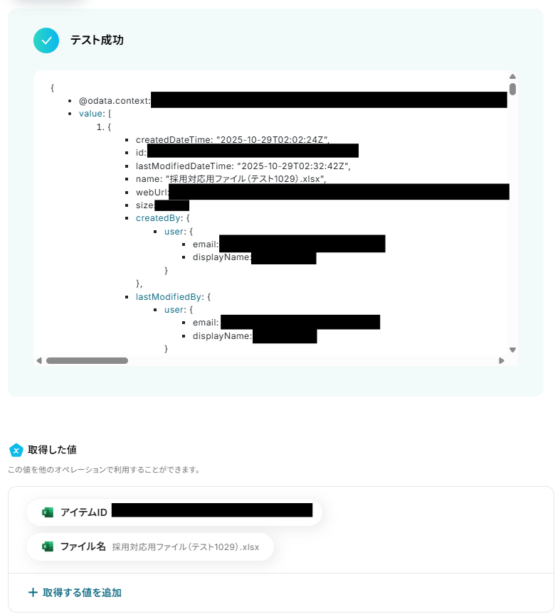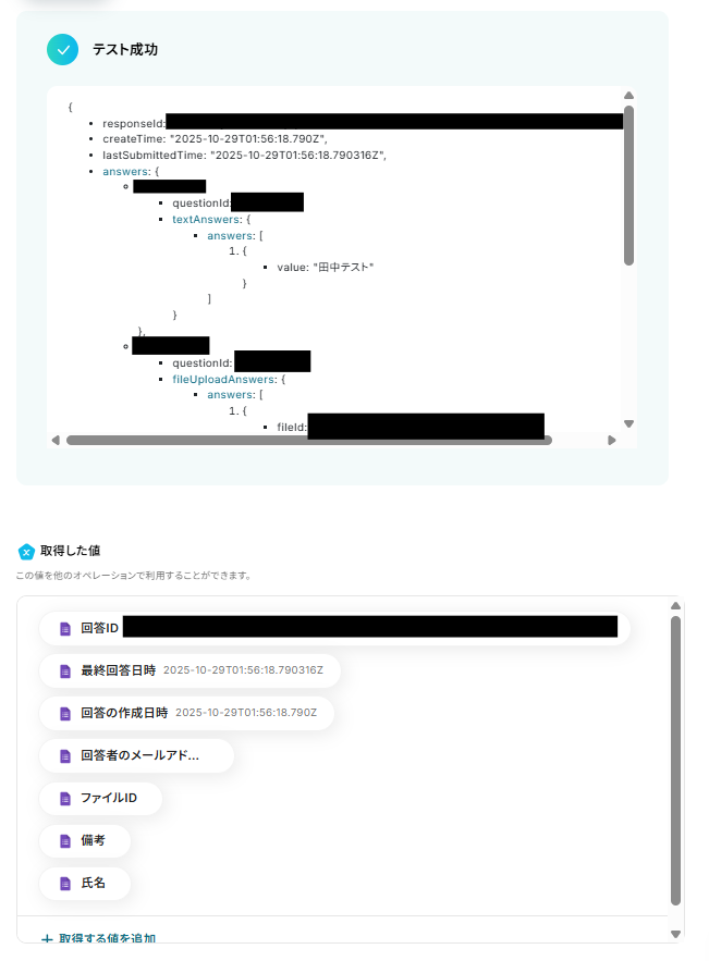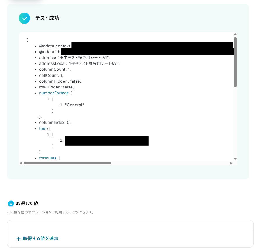 テストに成功すると「取得した値」にデータが反映されます。