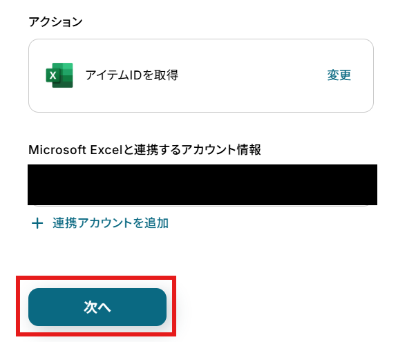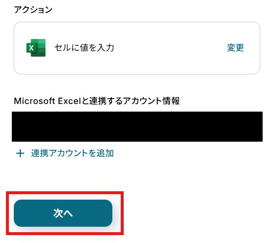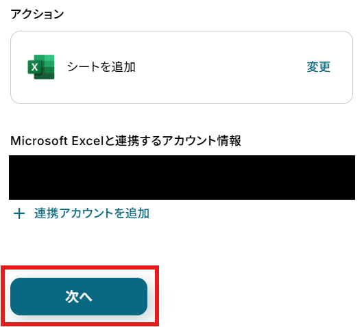 「Microsoft Excelと連携するアカウント情報」を確認し、「次へ」をクリックして進んでください。