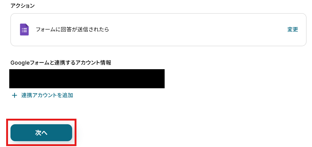 「Googleフォームと連携するアカウント情報」を確認し、「次へ」をクリックして進んでください。