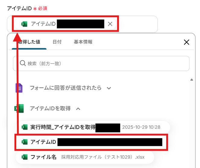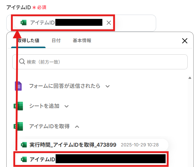 「アイテムID」を取得した値から設定しましょう。