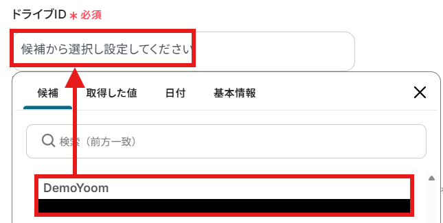 ・ドライブID/サイトID:欄をクリックし、OneDriveの場合はドライブID、SharePointの場合はサイトIDを選択します。
