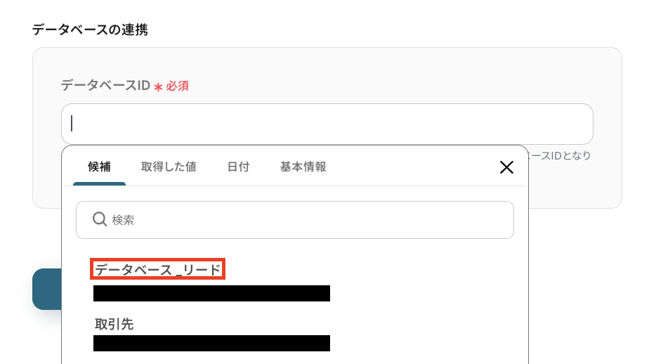「データベースID」には、フローで使用するデータベースを設定します。入力欄をクリックすると、連携しているアカウントから候補が表示されるので、候補から選択しましょう。