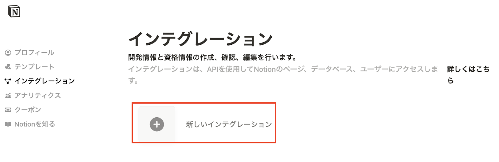 Notionのインテグレーションページにアクセスし、「新しいインテグレーション」をクリックして設定を開始します。