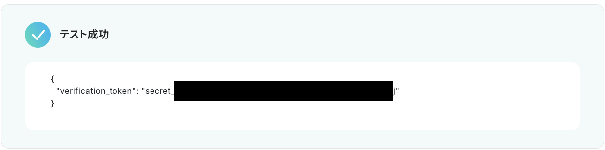 テストが成功すると、下図のような値が表示されるので、「{ "verification_token": "secret_⚪︎⚪︎⚪︎」の値のうち、⚪︎⚪︎⚪︎の部分をコピーしましょう。