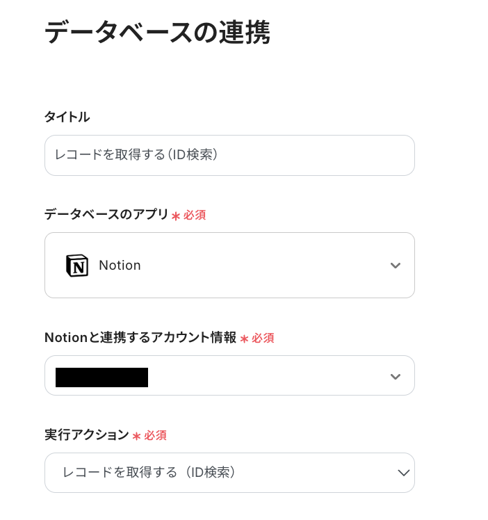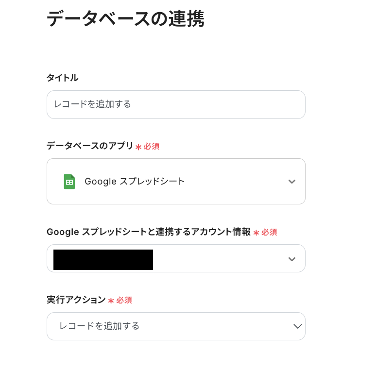 タイトルは必要に応じて編集し、アカウントはステップ3と同じものであるか確認しましょう。アクションは変更せず、データベースの連携設定に進みます。