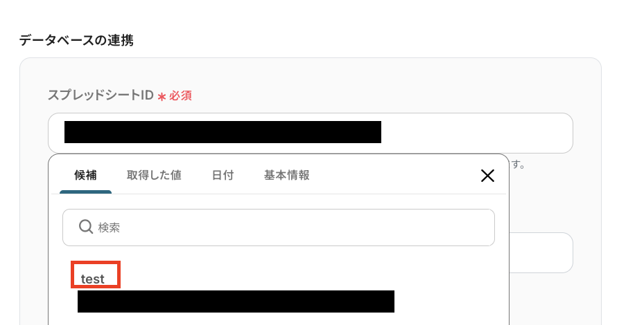 「スプレッドシートID」と「スプレッドシートのタブ名」を、入力欄をクリックして表示される候補から選択してください。