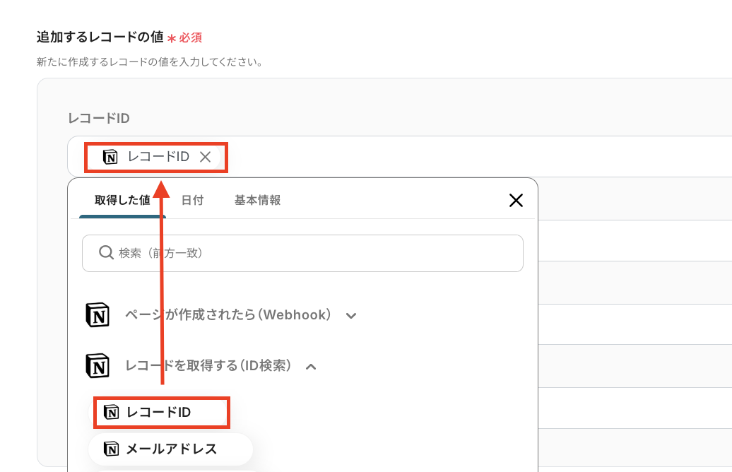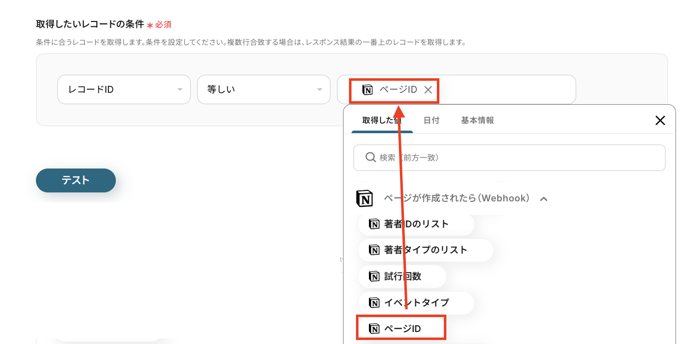 ここでは、ステップ3で取得したアウトプットを使って、「レコードID」「等しい」{{ページID}}と設定してください。