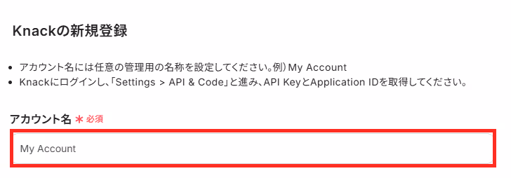 「アカウント名」「API key」「Application ID」を設定します。