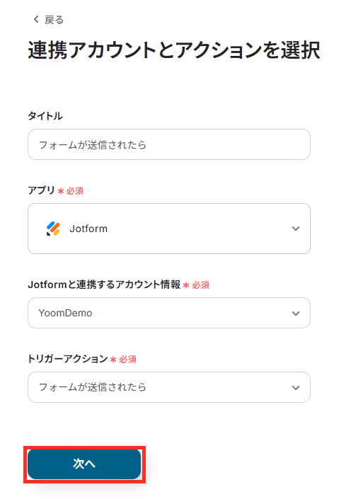 再度、Jotformと連携するアカウントに間違いがないかを確認し、「次へ」をクリックしましょう。
