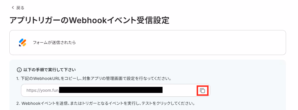 設定はJotformの管理画面で行うので、下記のWebhookURLをコピーし、Jotformの画面に移動しましょう。