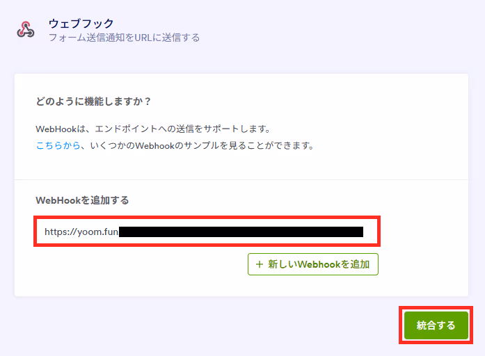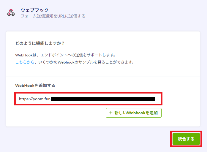 ウェブフックにYoomでコピーしたWebhookURLを貼り付け、統合します。