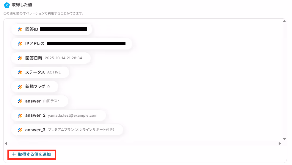 「+取得した値を追加」をクリックして、Jotformの回答情報を、取得した値に追加しましょう。