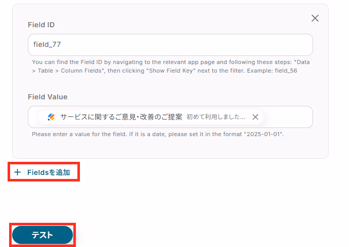 「Field Value」は、Field IDに合う値を「取得した値」から選択しましょう。