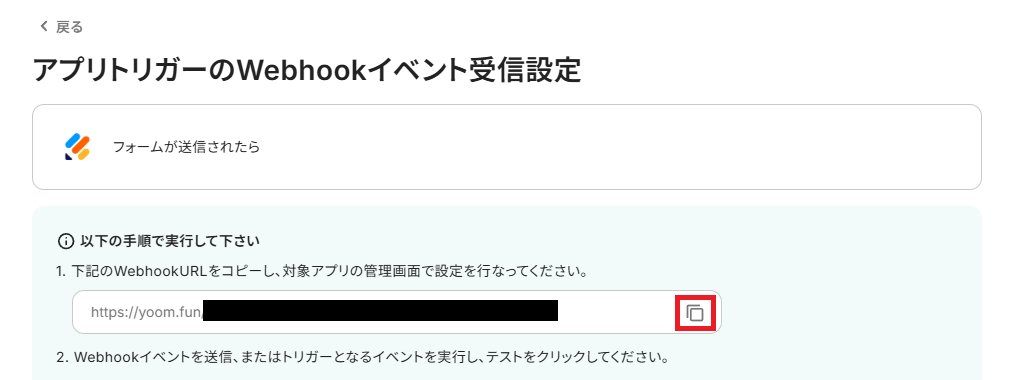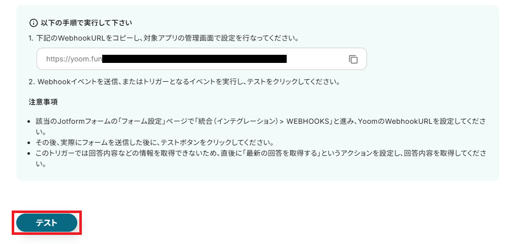 次に、Webhookのイベント受信設定を行います。 設定はJotformの管理画面で行うので、下記のWebhookURLをコピーし、Jotformの画面に移動しましょう。