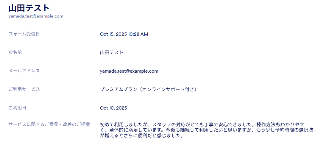 設定できたら、Jotformでトリガー(フォームが送信されたら)を行いましょう。 送信する回答は、架空の情報(「山田テスト」や「テスト会社」など)でOKです。