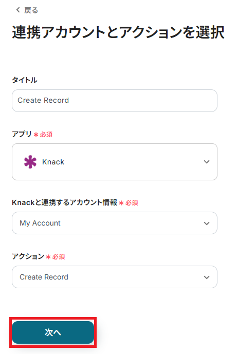 クリックすると以下の画面に切り替わります。 Knackと連携するアカウントに間違いがないかを確認し、「次へ」をクリックしましょう。
