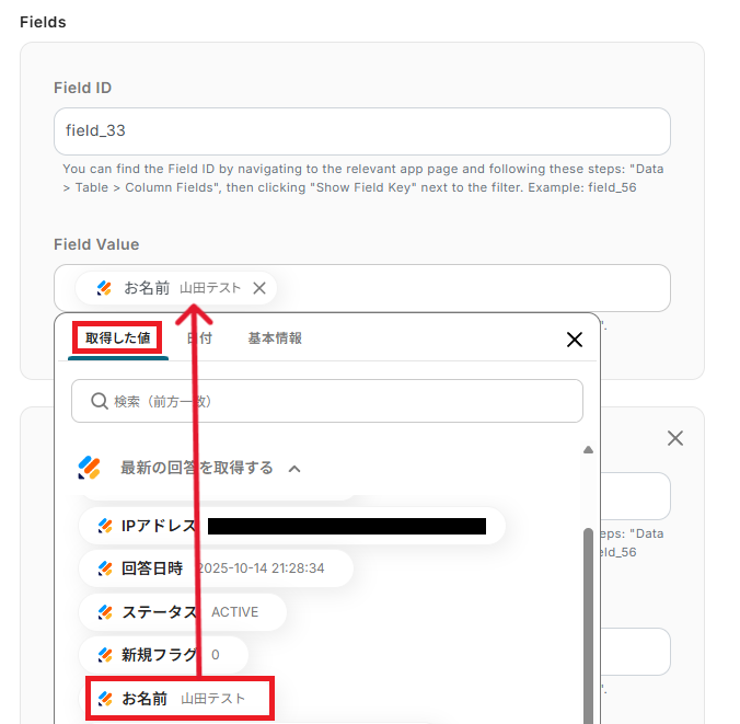 「Field Value」は、Field IDに合う値を「取得した値」から選択しましょう。 取得した値を活用することで、固定値ではなく、トリガーが実行されるたびに最新の情報が反映されます。