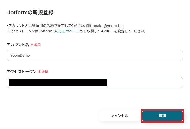 「アクセストークン」は、こちら から取得し、入力してください。 最後に「追加」をクリックしましょう。