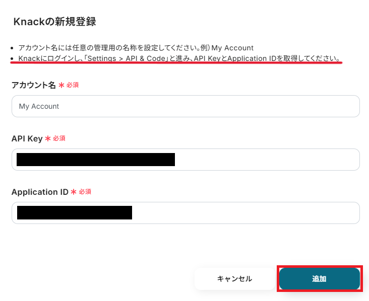 「API key」「Application ID」は注釈に沿って取得し、最後に「追加」をクリックしましょう。