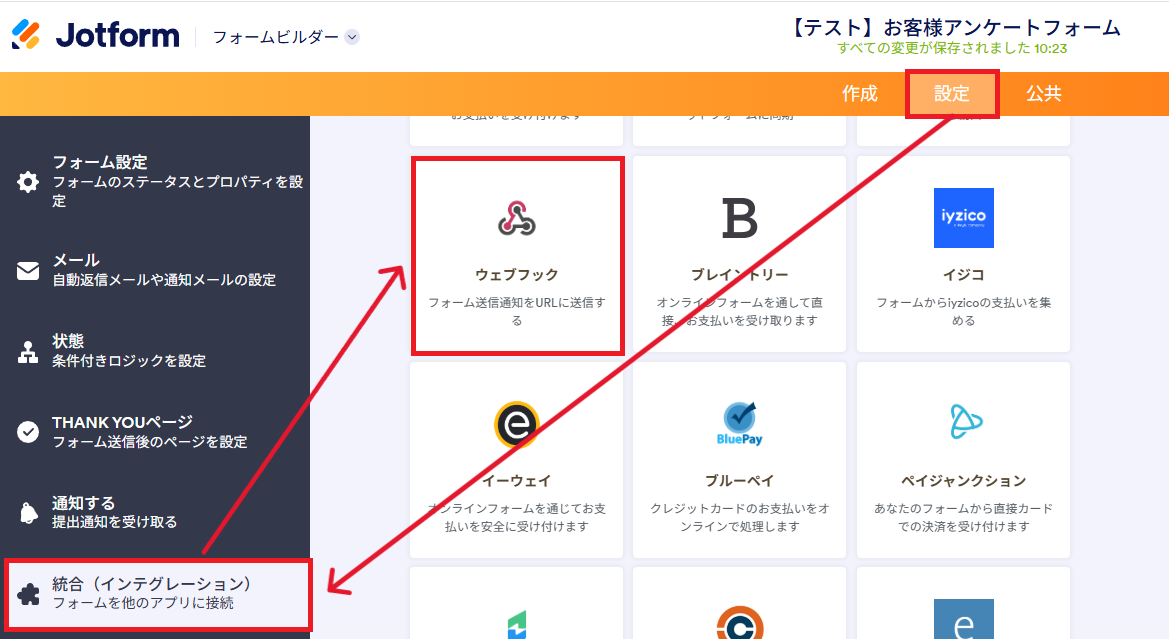 連携するフォームの「設定」→「統合」→「ウェブフック」の順でクリックしてください。