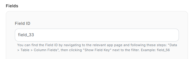 次に、Fieldを設定していきます。 「Field ID」は、Knack上の該当カラムのField IDを指定します。
