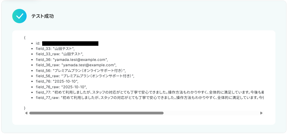 テストに成功すると「テスト成功」と表示されますが、取得した値が空の状態です。 次のJotformのアクションで詳細を取得するので、このまま「保存する」を押してください。