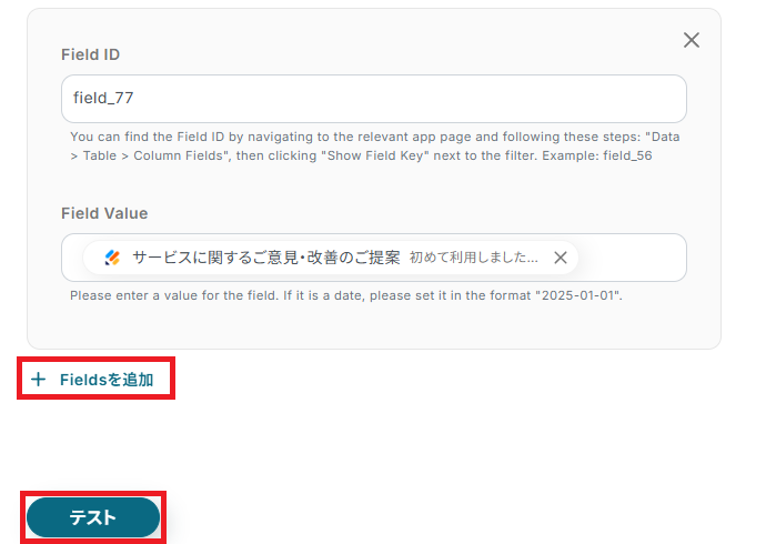 「+Fieldsを追加」 をクリックすると、新しい項目を追加することが可能です。 必要に応じて設定してみてくださいね。 全ての設定が完了したら「テスト」を行いましょう。