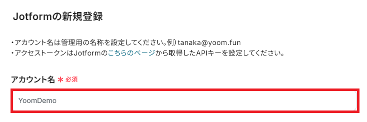 「アカウント名」と「アクセストークン」を設定します。 「アカウント名」は、任意で管理用名称を設定してください。