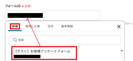 フォームIDは、トリガーで回答したフォームを「候補」から選択しましょう。 候補は、マイアプリに登録したアカウントに紐づいて表示されます。 設定後に「テスト」を行ってください。