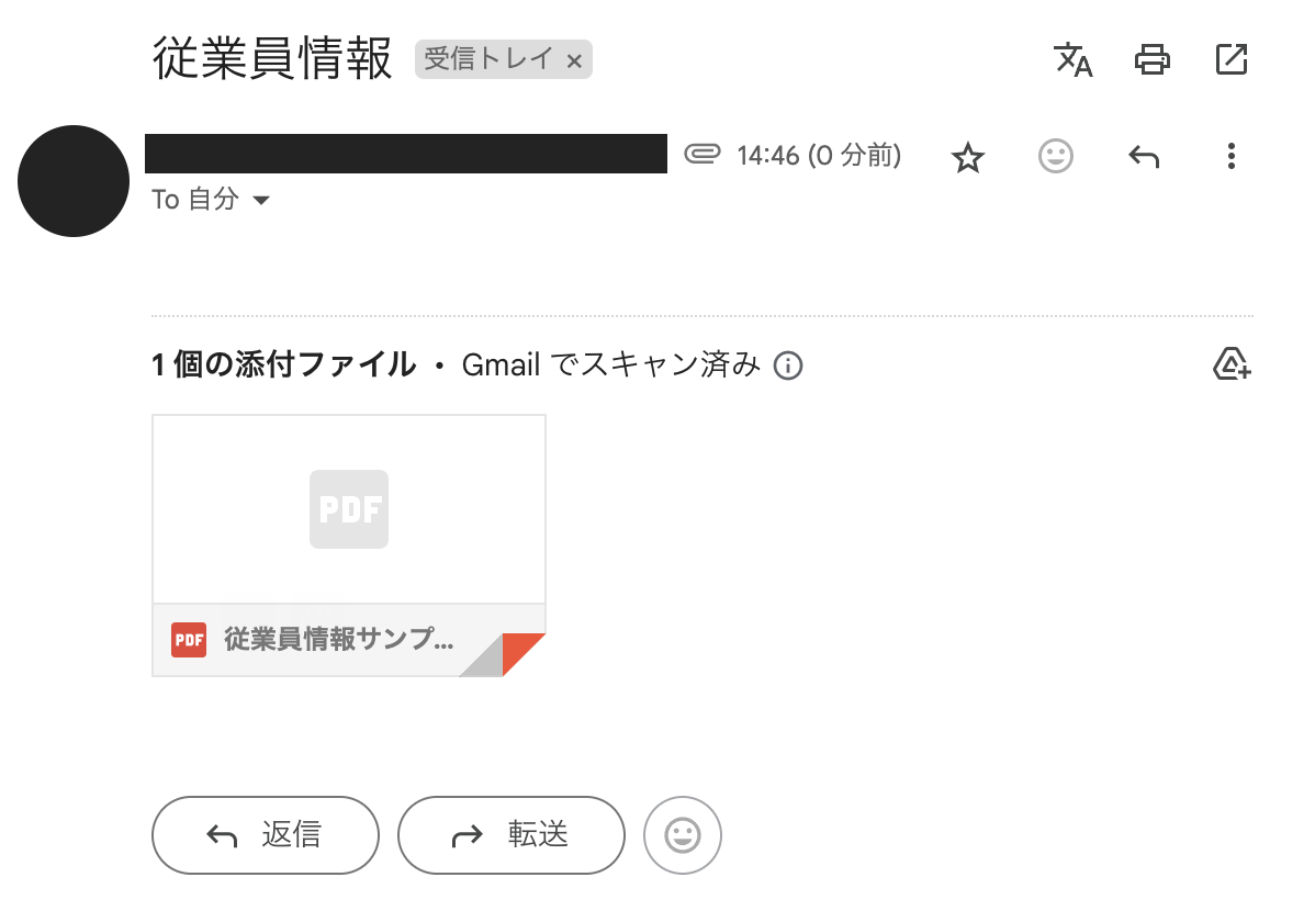 次に、フローの起動テストのために、テストメールを用意します。 OCRで従業員情報を読み取りたい画像やPDFを添付し、かつ先ほど設定したキーワードを含めたメールを、連携したGmailアカウント宛にテスト送信しましょう。 今回は「従業員情報」をキーワードに設定し、以下のようなテストメールを送信しました。