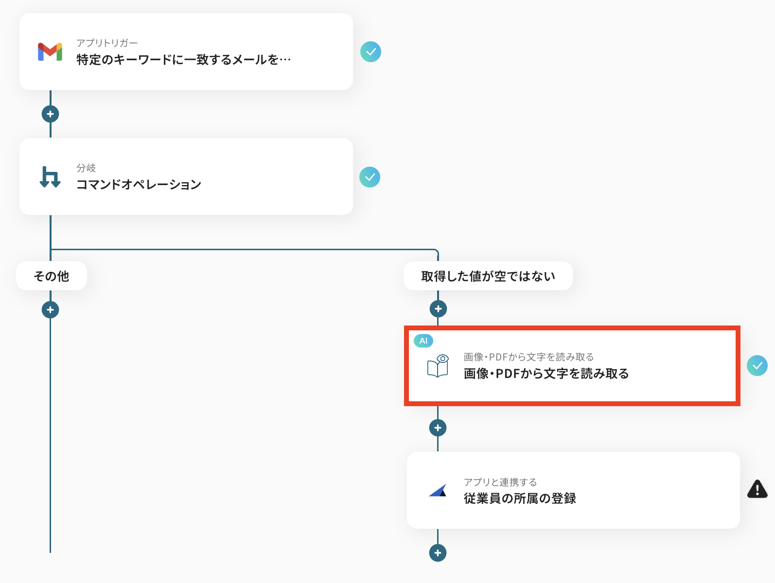 次のステップ「画像・PDFから文字を読み取る」も、先ほどの分岐同様、テンプレートでは既に設定されています。 使い方に応じて設定を変更できるので、一度確認してみましょう。