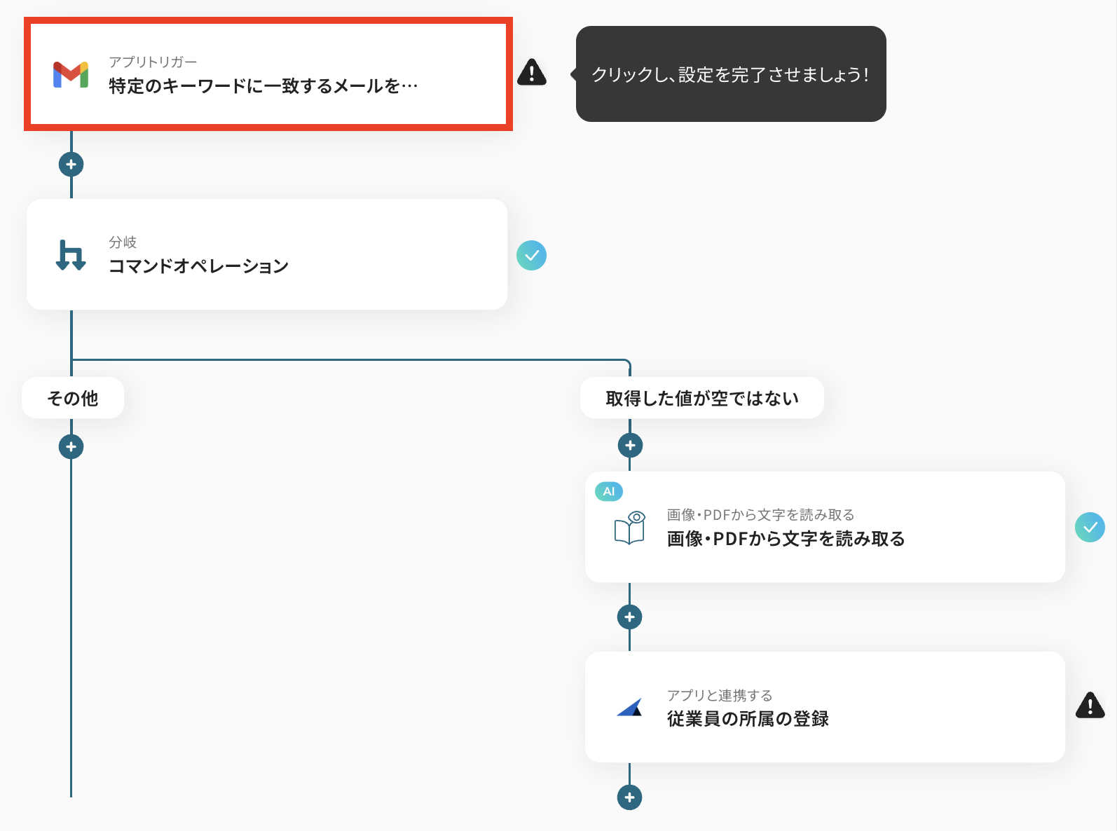 ■概要 「Gmailで受信したファイルをOCRで読み取り、バクラク共通管理で従業員の所属の登録をする」ワークフローは、従業員情報の管理を自動化し、業務効率を向上させる業務ワークフローです。 Gmailに届いた従業員関連のファイルをYoomがOCRで読み取り、必要なデータをバクラク共通管理に自動登録します。 これにより、手動入力の手間や入力ミスを削減し、正確なデータ管理を実現します。 ■このテンプレートをおすすめする方 ・Gmailで従業員情報を管理しており、手動入力に時間がかかっている人事担当者の方 ・バクラク共通管理を利用して従業員の所属情報を管理していて、データ入力の自動化を検討している企業の方 ・OCR技術を活用して業務効率化を図りたいIT担当者の方 ・複数のSaaSアプリを連携させて業務ワークフローを最適化したい方 ■注意事項 ・Gmail、バクラク共通管理のそれぞれとYoomを連携してください。 ・分岐はミニプラン以上のプランでご利用いただける機能(オペレーション)となっております。フリープランの場合は設定しているフローボットのオペレーションはエラーとなりますので、ご注意ください。 ・ミニプランなどの有料プランは、2週間の無料トライアルを行うことが可能です。無料トライアル中には制限対象のアプリや機能(オペレーション)を使用することができます。 ・OCRまたは音声を文字起こしするAIオペレーションはチームプラン・サクセスプランでのみご利用いただける機能となっております。フリープラン・ミニプランの場合は設定しているフローボットのオペレーションはエラーとなりますので、ご注意ください。 ・チームプランやサクセスプランなどの有料プランは、2週間の無料トライアルを行うことが可能です。無料トライアル中には制限対象のアプリやAI機能(オペレーション)を使用することができます。