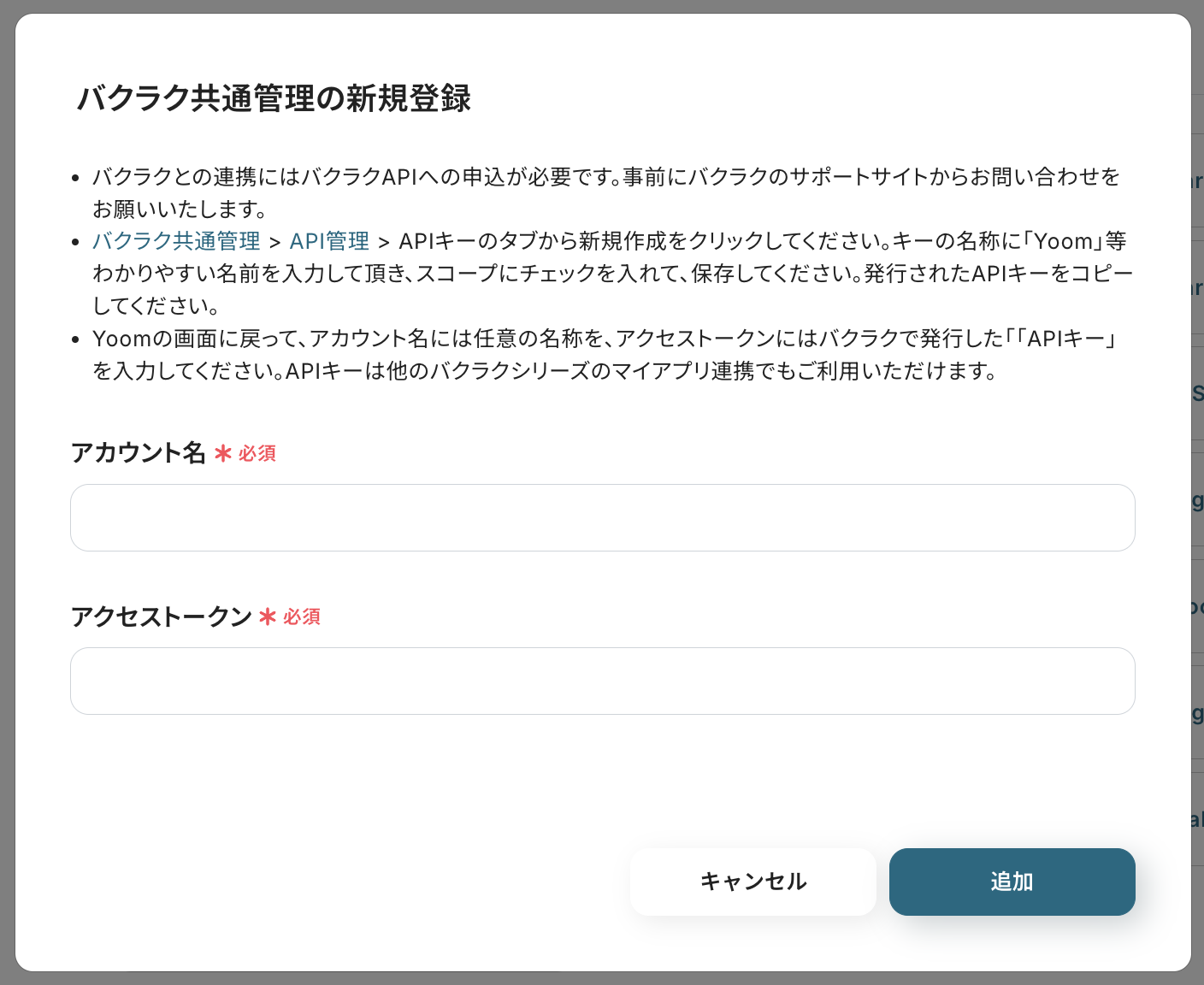 以下の画面が表示されます。案内に従って、バクラク共通管理でアクセストークンを入手し、欄に入力してください。