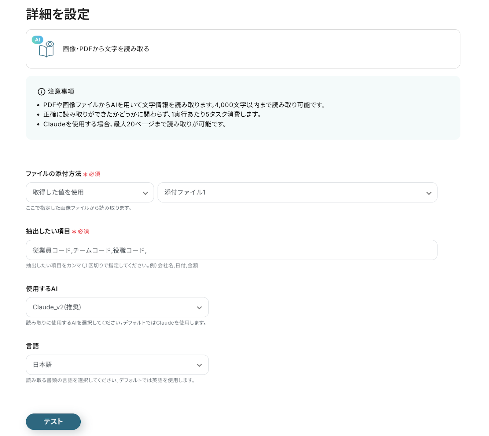 設定が完了したら「テスト」をクリックし、ステップ3でテストメールに添付したファイルから、今回設定した抽出したい項目が読み取れているか確認しましょう。 問題なければ保存して、OCRのアクション設定は完了です!