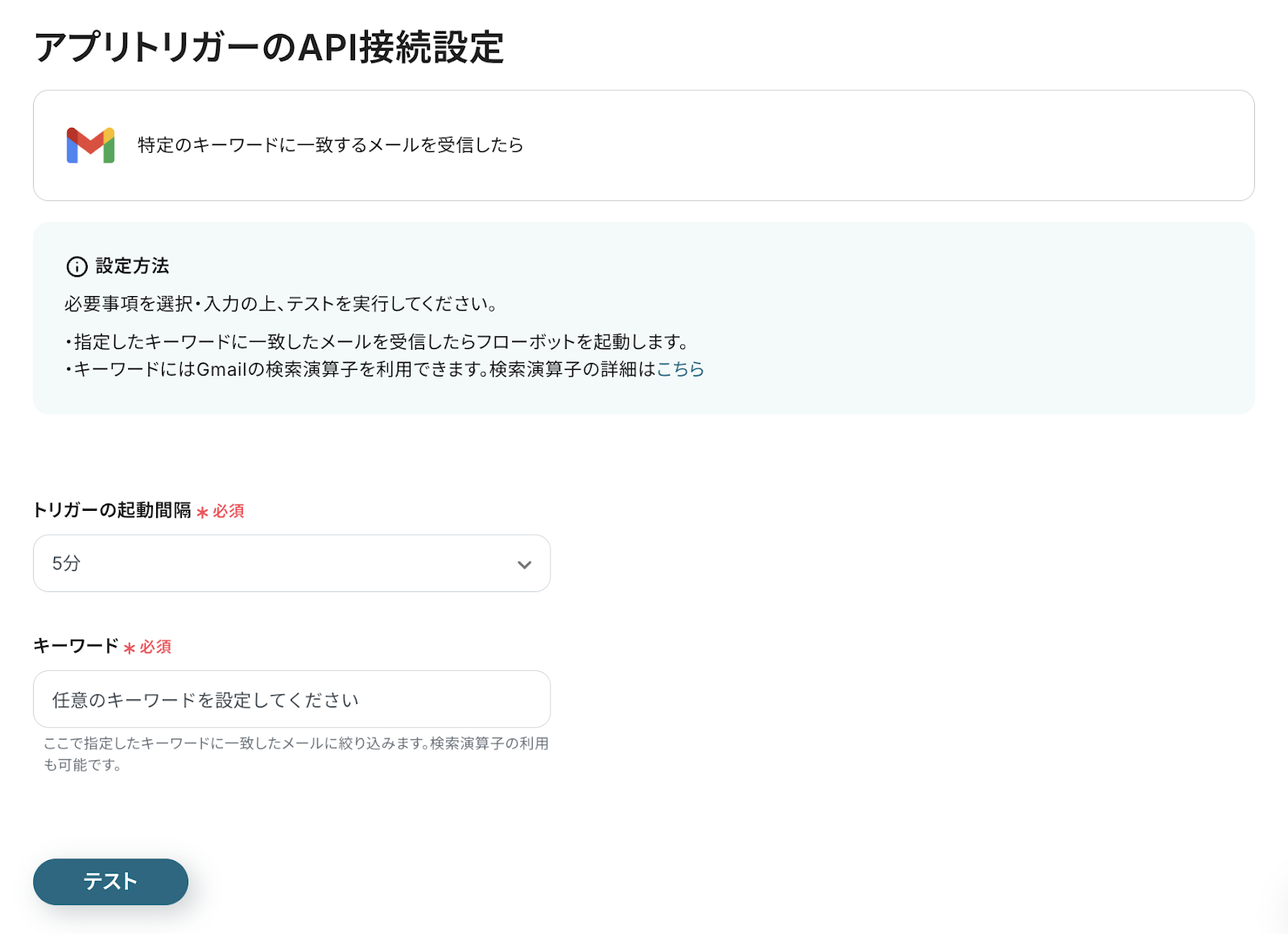 遷移した以下の画面で、自動化フローを起動するトリガーの起動間隔とキーワードを設定しましょう。