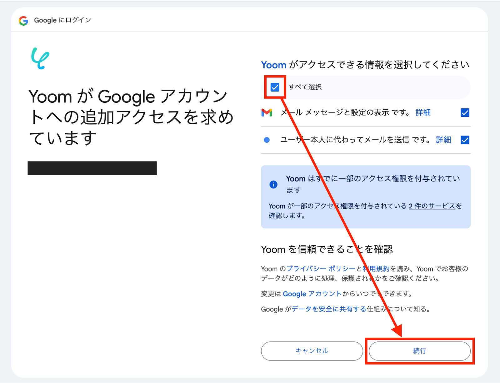 以下のアクセス権選択の画面が表示されたら「すべて選択」にチェックを入れ、「続行」をクリックします。