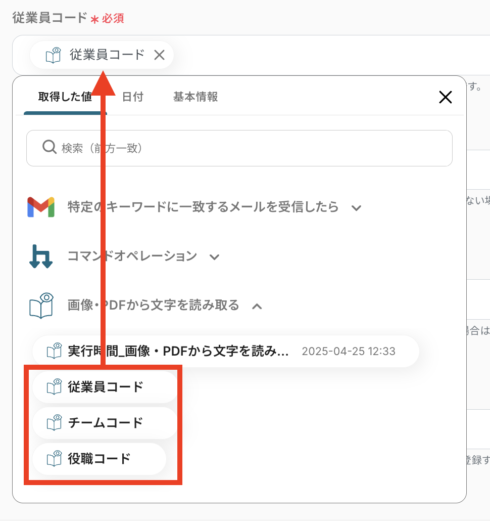 従業員コード、チームコード、役職コードはデフォルトで設定されています。 手動で設定したい場合は、以下のように各入力欄をクリックして、OCRで読み取った項目を選択してください。