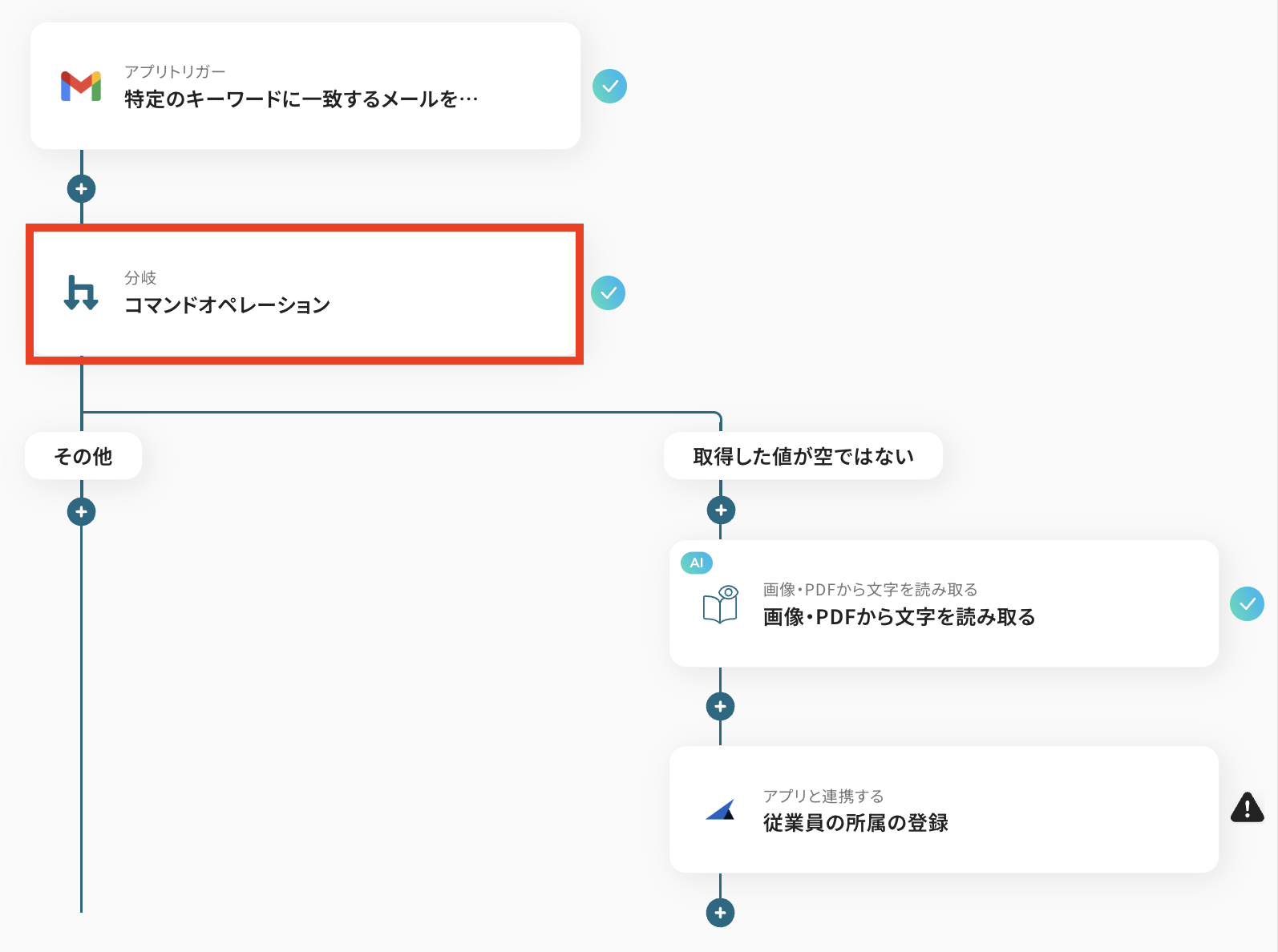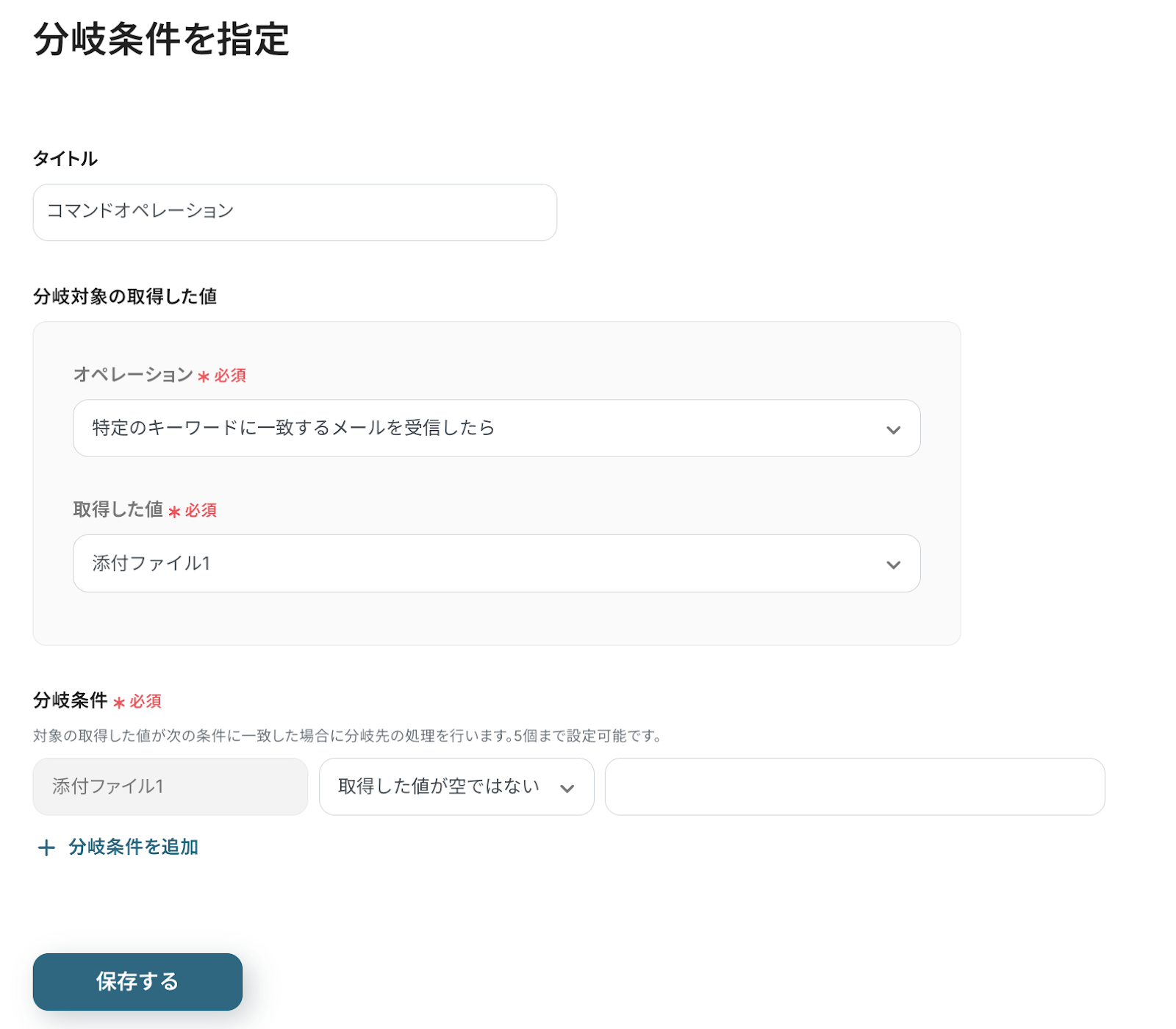 以下のように、分岐条件を細かく設定することができます。 なお、今回使用しているテンプレートでは、メールにファイルが添付されていたらOCRで読み取るよう条件が設定されています。問題なければそのまま保存し、次のステップに進みましょう。