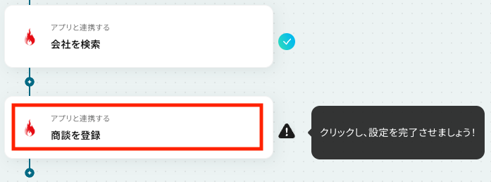 - 条件が「取得した値が空」の場合、「会社を登録」アクションと「商談を登録」アクションを追加