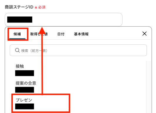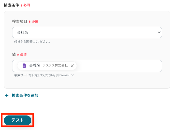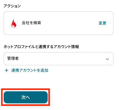 - アクション:テンプレート通りに「会社を検索」を選択します。
