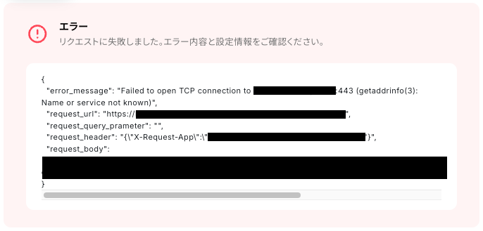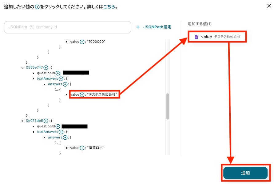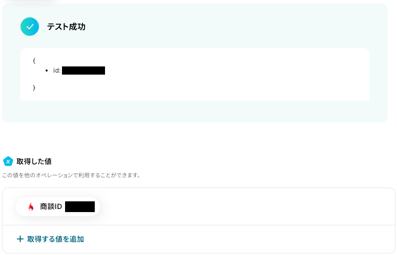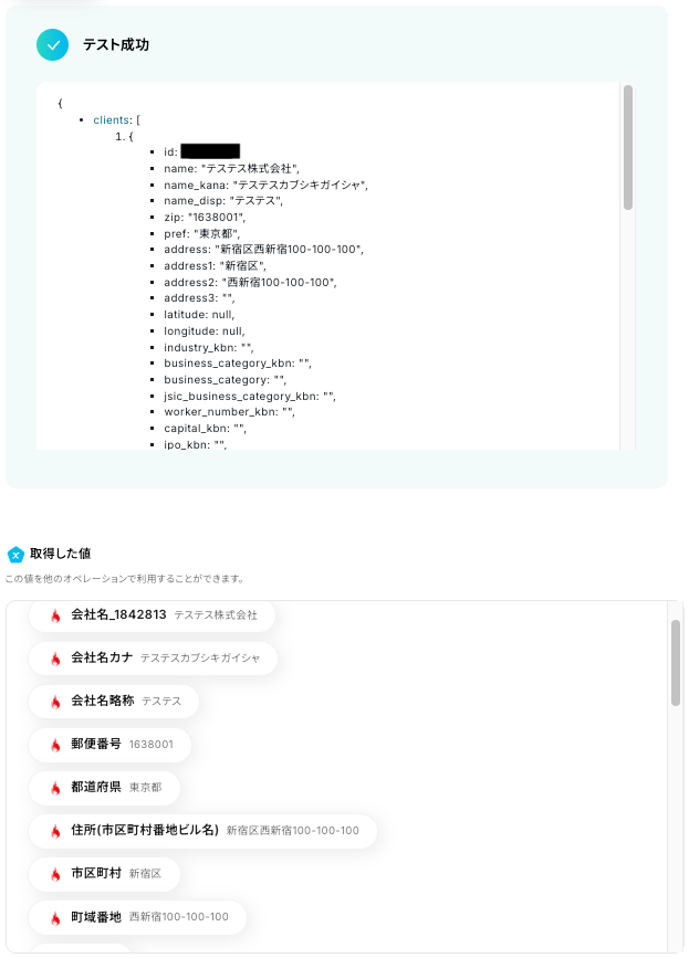 テストに成功すると、以下のように「取得した値」が表示されます。