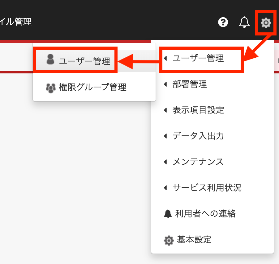画面右上の歯車アイコンをクリックし、「ユーザー管理」を選択してください。
