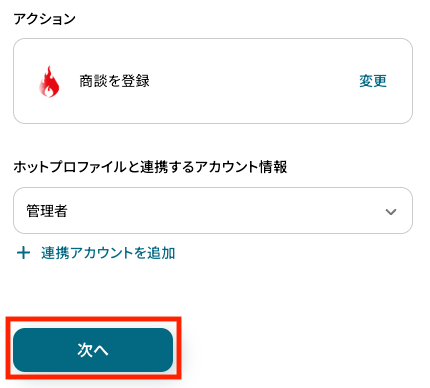 - アカウント情報:ステップ1で連携したアカウントが自動で選択されています。別のアカウントを使用したい場合は、「+ 連携アカウントを追加」 から変更可能です。