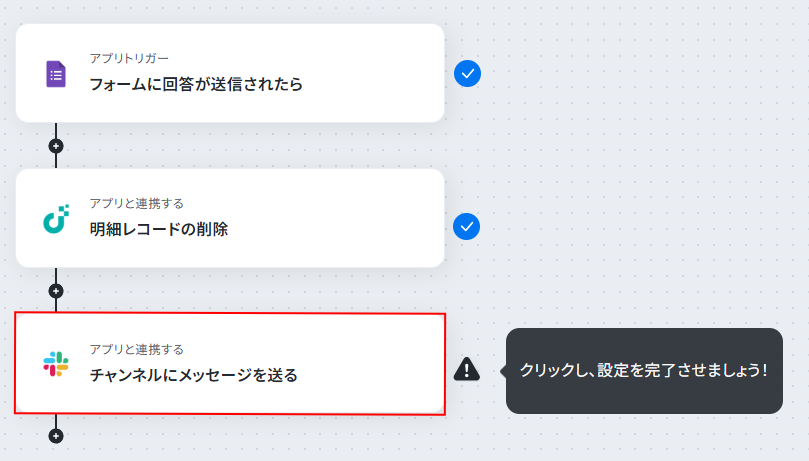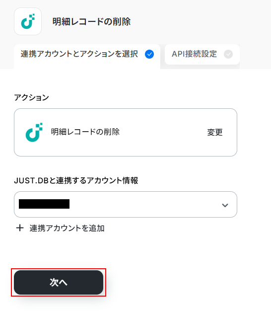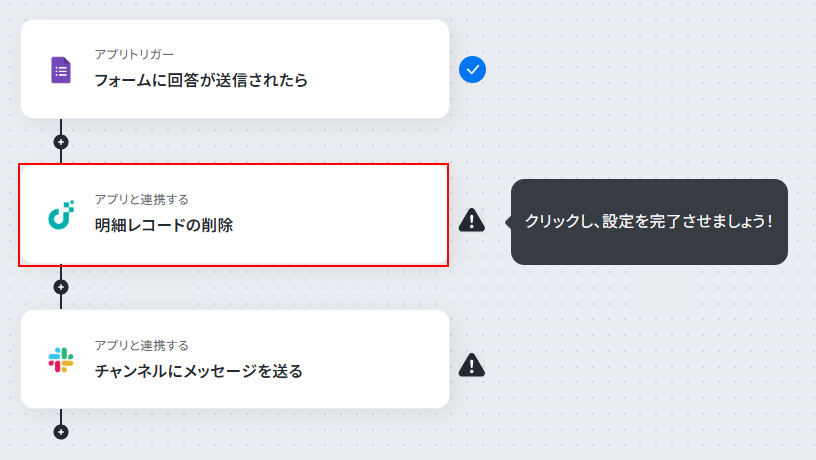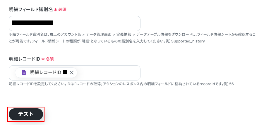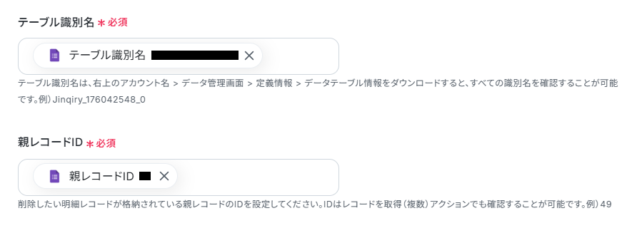 レコードIDを取得したら、「レコードの取得」アクションを実行して明細レコードIDを取得し、「明細レコードの削除」アクションで削除するといったように設定しましょう。