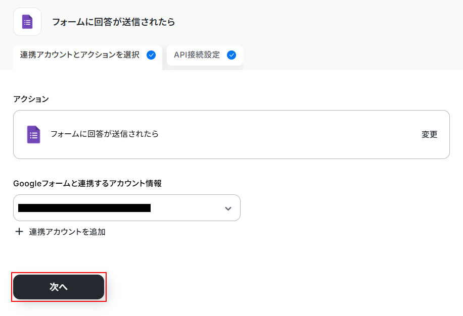 連携するアカウント情報にはステップ1で連携したアカウントか、連携時に使用していたYoomのアカウントが表示されます。